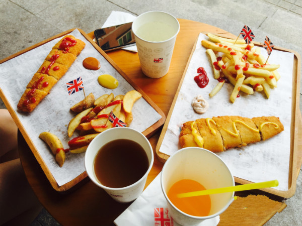 超级套餐:里面是有英式鳕鱼+黄金薯角+饮料的搭配。饮料有碳酸饮料和柠檬红茶,选的是柠檬红茶,热腾腾的,酸甜度正好,配着油炸食品吃的确是很解腻。酱料是自助的,一共有四种——塔塔酱,蜂蜜芥末酱,番茄酱,甜辣酱。