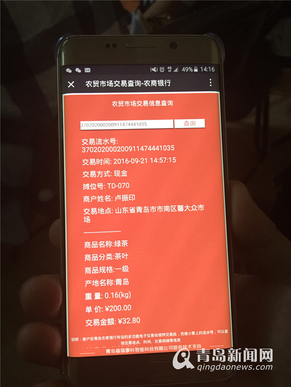据市南区市场监管局相关人员介绍,可溯源电子秤约束了商家利用秤具作弊的行为。因为数据联网上传到监管部门,每一台电子秤每笔交易都是可查询的,这样也让商家们的行为时时都处于监督之下,监管部门可以顺着追溯系统掌握每一个节点的消费和计量情况,让监管人员也如虎添翼。看似花费了一些成本,但从长远经营及监管来看,可溯源电子秤背后代表的透明、诚信经营是必然趋势;此外,该系统还率先开发了消费者使用的手机APP,消费者下载到手机后,通过输入电子称打印小票记载的摊位号,查询自己交易的系统记录数据,进行核对,保证消费者放心消费,避免商户与消费者之间的纠纷,对双方维权都有好处。同时,该秤具备刷卡结算的功能,消费者不用带现金就可在农贸市场买东西,为消费者带来便利,也充分调动广大商户使用可溯源电子秤结算的积极性。