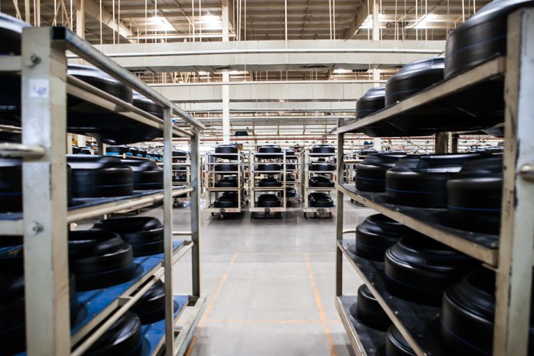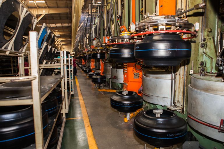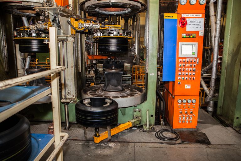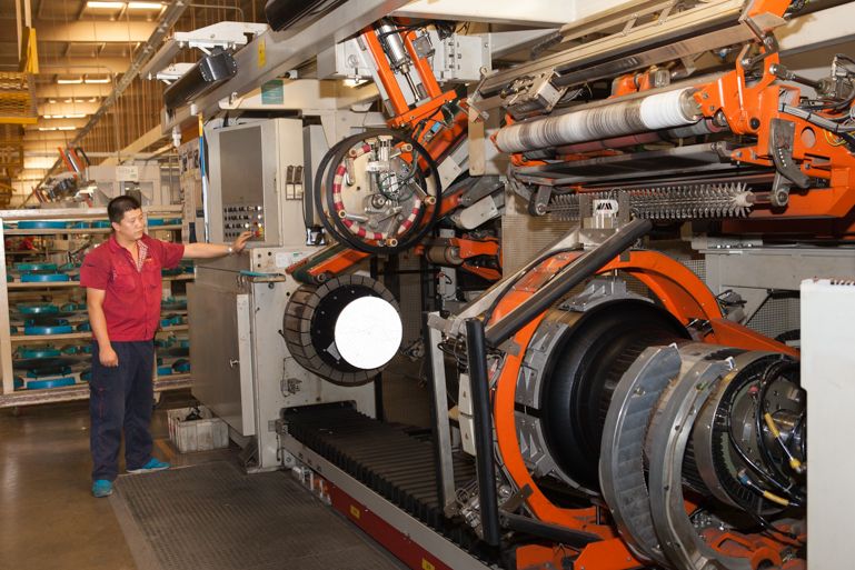 9月21日,“供给侧?山东策——第十二届中国网络媒体山东行”西线采访团走进万达宝通,采访团一行抵达万达宝通轮胎厂区,一下车就看见一个由轮胎堆成的“小巨人”正面带笑容欢迎大家,萌萌的样子吸引了不少记者拍照。现代化得车间一眼望不到头,胶部件经过准备工序后,被放到成型机上,一张方方正正的橡胶材料眨眼间就“变圆变胖”,一个黝黑簇新的生胎呈现在记者眼前。原来轮胎是靠吹的!随后这些黝黑的家伙还要经过硫化、修面、检测的过程,最后坐上“快车”通过现代化的仓储中心发往世界各地。(大众网撒伟 摄影报道)