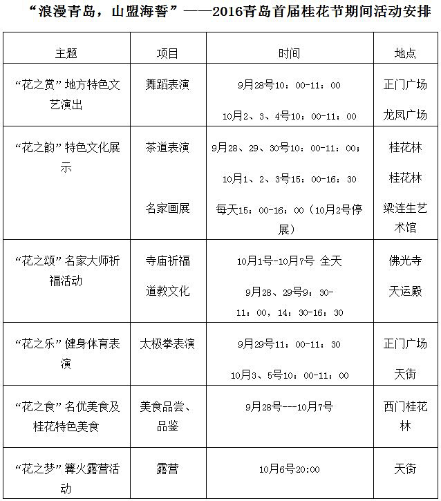 金秋十月,丹桂飘香,美丽的岛城迎来了“海誓山盟”2016青岛首届桂花节。青岛桂花节是山海民俗文化与都市旅游相结合的节庆活动,充分发挥石老人观光园和“山”“海”“桂”得天独厚的园林优势,以景点游览、民俗文化娱乐为主,构成“游、购、娱”一体的旅游节目。