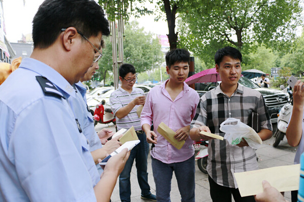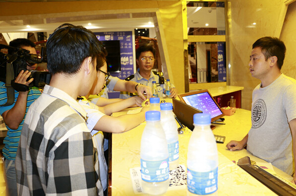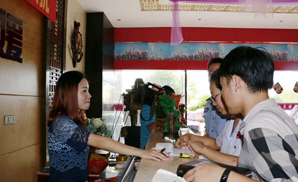 临近饭点,在某大酒店对一可疑发票进行认真辨别。
