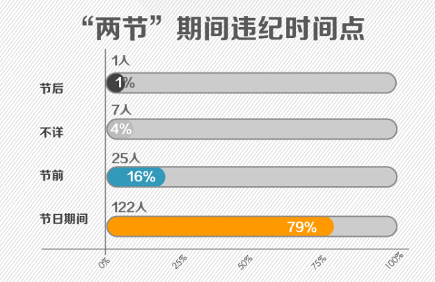 从违纪的时间节点看,79%涉事者违纪行为发生在中秋、国庆“两节”期间。节日期间人情往来密集,是“四风”问题的集中爆发期,这也印证了中央一个节点一个节点纠“四风”是有的放矢的。