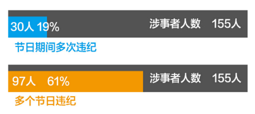 从违纪频次看,被通报的155位领导干部,19%节日期间多次违纪。如2013-2015年国庆等节假日期间,福建省工业设备安装有限公司董事长官家培使用公车办理私事,达17次之多。61%的涉事者在中秋国庆、五一春节等多个节日都存在违纪行为,有的甚至连劳动节都不放过。如,2013年1月至2015年6月,贵州省黔农融资信用担保中心在元旦、春节、劳动节、端午节、中秋节、国庆节等节假日,违规发放“福利费”共计69.9万元。可见“四风”病根未除、病源还在,防止反弹任务艰巨。