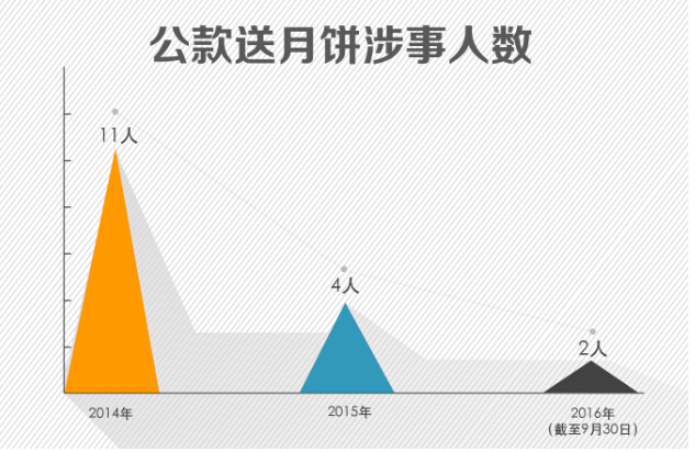 再看备受关注的公款送月饼问题。三年多来,公款月饼在礼品中仍占有一定比例,但下滑迹象明显。从此次梳理的155起案例看,2014年有11人,2015年4人,2016年(截至9月30日)仅2人。