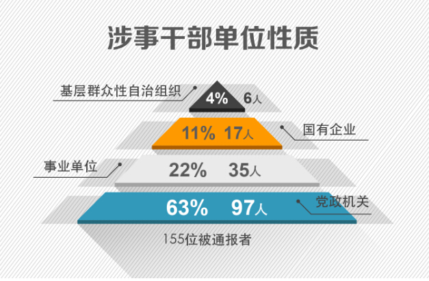 从分布领域看,155位被通报者,以党政机关干部最多,占六成以上;事业单位、国有企业位居其次;村委会、居委会干部相对较少。
