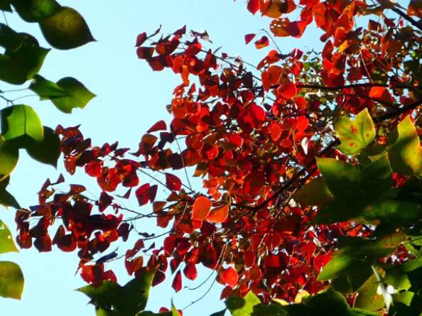 推荐理由:乌桕树冠常呈圆球形,入秋叶色红艳可爱,“巾子峰头乌桕树,微霜未落已先红”正是描写了乌桕树的色彩之美。除了树叶外,秋冬时节白色的乌桕籽挂满枝头,经久不落,也非常美丽。
