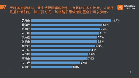 再来看看十一租车用户画像。数据显示滴滴租车用户较为年轻化,其中90后占比就已经到27.1%,也就是说平均4个租车用户里至少1个90后同学,80后和90占到了85%。在职业上,计算机、互联网行业人群占比为53.9%。而从星座分析,天秤座最爱租车,天生选择困难的他们一定是经过多方权衡,才选择最适合他们的一种出行方式,排名第二的是处女座。