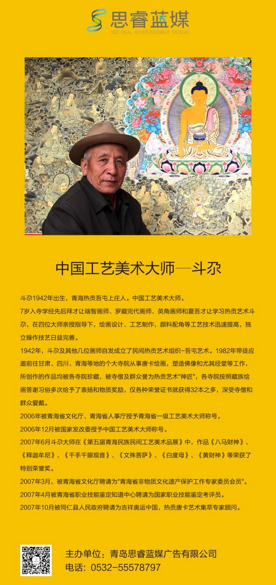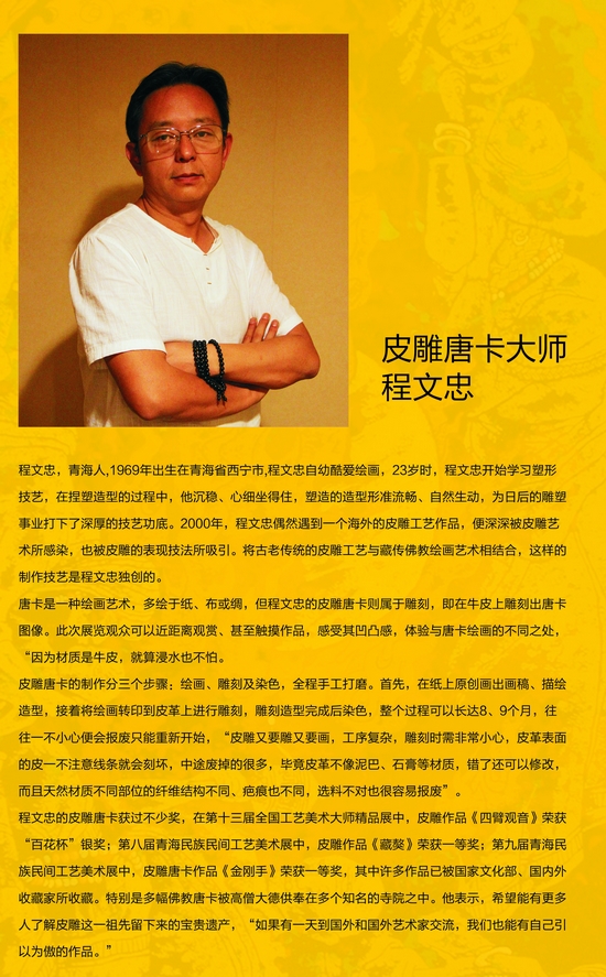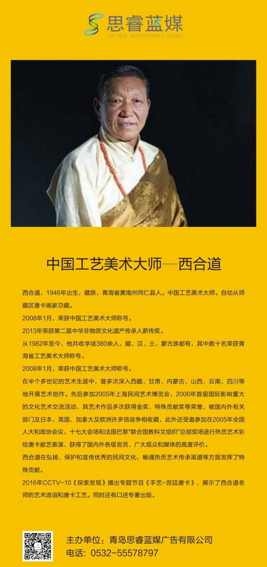 此次唐卡展将展出中国工艺美术大师、国家级非物质文化遗产代表性传承人西合道(1946出生于青海)和中国工艺美术大师斗尕(1942出生于青海)的精品唐卡及其弟子的作品60余幅,同时还有皮雕唐卡首次亮相于青岛,是绝无仅有的精彩盛宴。咨询电话0532—55578797。
