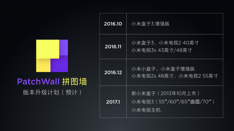 此外,王川还公布了小米电视全系产品升级PatchWall拼图墙人工智能系统的具体计划,如下: