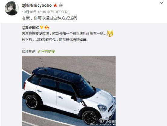 她转发的是聚美CEO陈欧抽奖送豪车的微博,那条微博在当时几乎刷爆了热搜。
