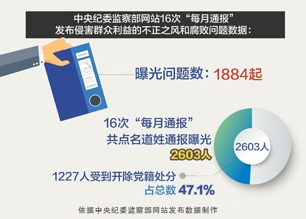 据中央纪委监察部网站“每月通报”发布数据显示,自2015年7月始,16次“每月通报”共曝光侵害群众利益的不正之风和腐败问题1884起,点名道姓通报曝光2603人,其中有1227人受到开除党籍处分,占总人数47.1%。各级纪检监察机关始终保持遏制腐败的高压态势,释放越往后执纪越严的强烈信号。