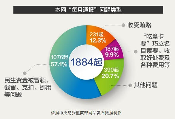 16次“每月通报”的1884起问题中,涉及民生资金被冒领、截留、克扣、挪用等问题共1076起,占57.1%。
