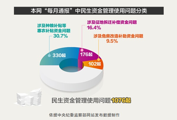 基层腐败问题点多面广,在涉及民生资金管理使用的问题中有三类问题较突出:涉及种粮补贴等惠农补贴资金问题330起、涉及征地拆迁补偿资金问题176起、涉及危房改造补助资金问题102起,分别占民生资金管理使用问题的30.7%、16.4%、9.5%。