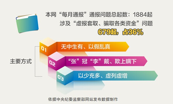 在本网“每月通报”的1884起问题中,679起涉及虚报套取、骗取各类资金,占总数36%。