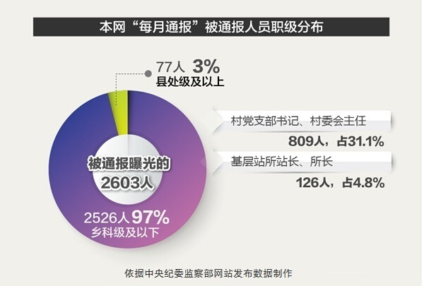 在本网“每月通报”曝光的2603人中,县处级及以上人员77人,占3%;乡科级及以下2526人,占97%。村党支部书记、村委会主任809人,占总人数31.1%,基层站所站长、所长126人,占总人数4.8%。