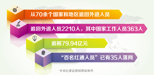 2014年至2016年9月追逃2210人追赃79.94亿。“百名红通”人员35人到案