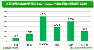 数据显示,平均约每5.4天,犯罪分子就能够使用一个电话号码完成一次成功或接近成功的诈骗。其中,境外呼入的诈骗电话效率最高,一个号码约平均每7个小时就能成功诈骗一次,但其代价是巨大的拨打量;其次是手机号码,一个号码约平均每两天就能成功诈骗一次。360专家提醒,今后用户接到来自境外的不明电话时一定要更加提高警惕。