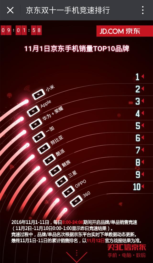 2016年的双11电商大促活动已经开场,在京东今天零点开始上线的双十一手机竞速排行榜中可以看到,一直截止到今晨9点,手机销量排行前三位分别是:小米、苹果、华为+荣耀,尤其是小米手机的销量一直遥遥领先,从容拔得此次双11开局头筹。
