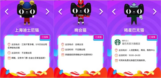 据悉,在“寻找狂欢猫”游戏中共有60只不同形象、不同出没“习性”和不同功能的猫咪。例如,即将到来的“迪士尼时刻”,消费者打开游戏将发现满屏的上海迪士尼猫,成功将其寻获即有可能赢取天猫双11迪士尼奇妙家庭狂欢日3人门票,甚至有机会全家人在神秘地点与马云共进私人晚宴;成功寻获星巴克、肯德基猫,则将有机会免费获得星巴克拿铁咖啡、为天猫双11特别定制的星巴克饮品“可可魔力喵”,或肯德基全家桶、烤鸡腿堡等;成功寻获晚会猫的消费者,则可以提前加入天猫双11晚会的红黑战队,获得首轮特权,更有机会赢取群星璀璨的双11晚会入场券……