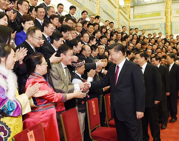 上午9时30分,习近平等来到人民大会堂金色大厅,同代表们亲切握手,并合影留念。