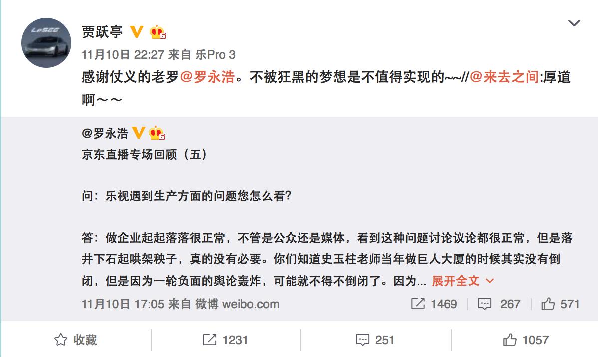 贾跃亭对老罗的力挺进行了回应:感谢仗义的老罗。不被狂黑的梦想是不值得去实现的。