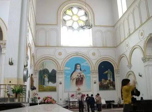 教堂装饰系采用意大利文艺复兴时期形式。顶棚悬有七个大吊灯,配之穹顶的圣像壁画,是青岛地区最大的哥特式建筑,也是中国唯一的祝圣教堂