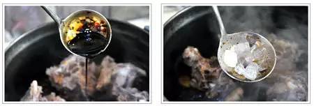 3、放入羊蝎子炒匀,放入老抽、生抽、烹入料酒。再放入冰糖入锅。
