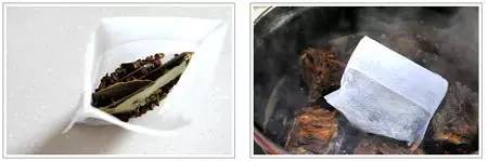 4、香料混合(花椒1茶匙+茴香1茶匙+香叶2片+桂皮1片)倒在香料包中。把香料包投入锅中。