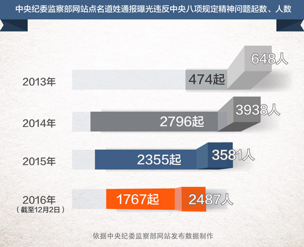 截至2016年12月2日,四年间,中央纪委监察部网站“违反中央八项规定精神问题监督举报曝光专区”已持续通报各类“四风”问题7392起,10654人被点名道姓公开曝光,日均通报曝光7.3人。