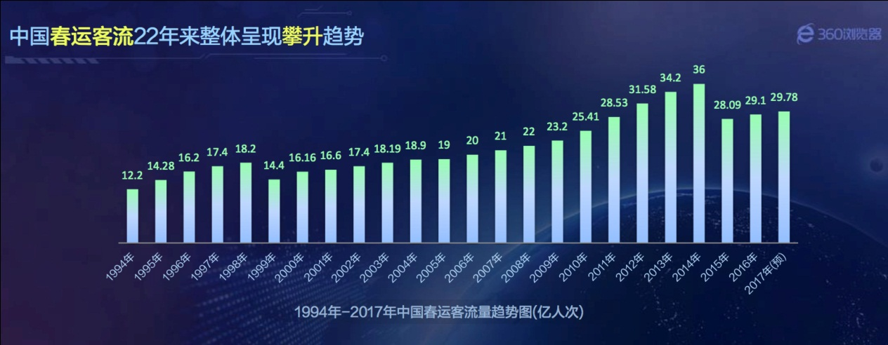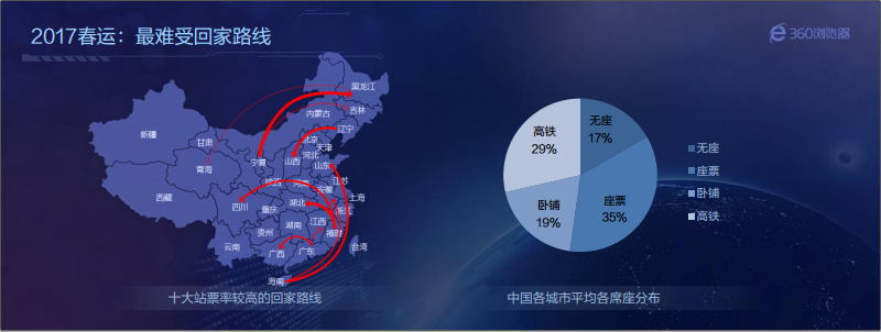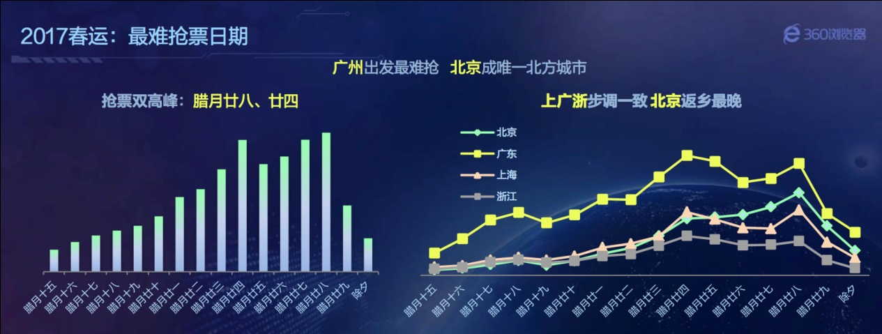 “史上最难抢票年”来了!12月7日,360在京发布了《2017年春运预测报告》。报告基于360浏览器历年的春运抢票大数据,从抢票热门省份、城市和路线、抢票高峰时段、春运座席分布、12306验证码分析、增加春运抢票难度的其他因素等角度,对今年春运购票形势进行了全方位预测分析。分析显示,由于预售期缩短、铁路总客流量大、节前学生和务工人员客流相互叠加、抢票时间集中、拉尼娜天气等因素,2017年将成为“史上最难抢票年”。
