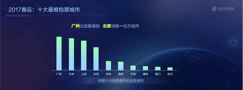 从抢票难度的始发城市来看,360大数据预测,2017年春运抢票热度最高的十大城市依次为:广州、北京、上海、深圳、杭州、 福州、 宁波、温州、厦门、武汉。北京是唯一进入前十的北方城市。