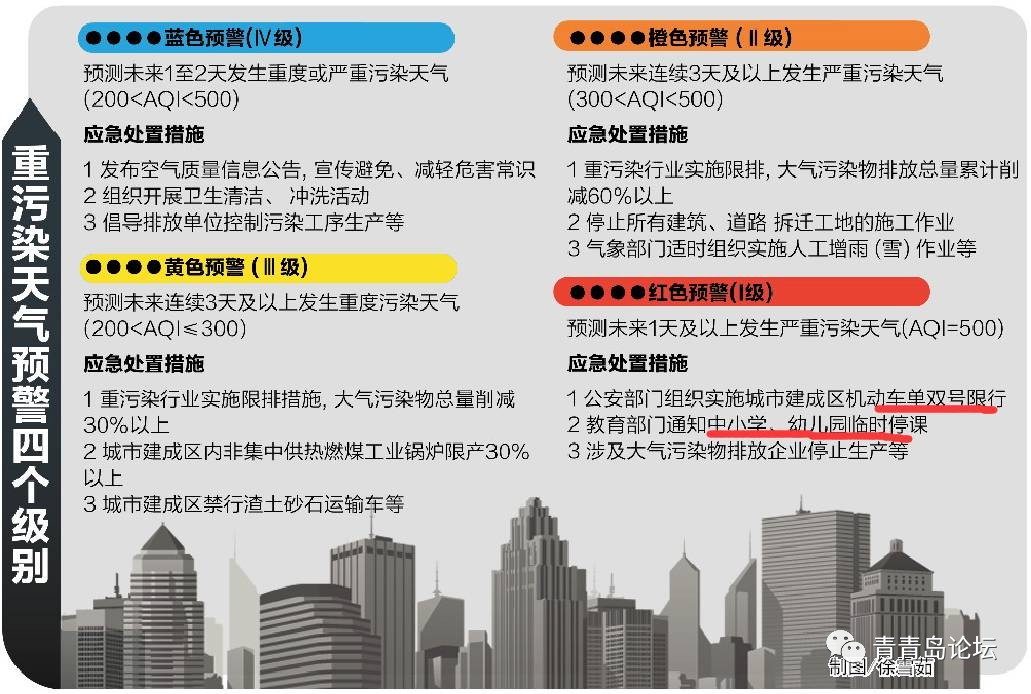 根据青岛市重污染天气应急预案,重污染天气预警从过去的3个级别增加为4个级别,由轻到重依次为: