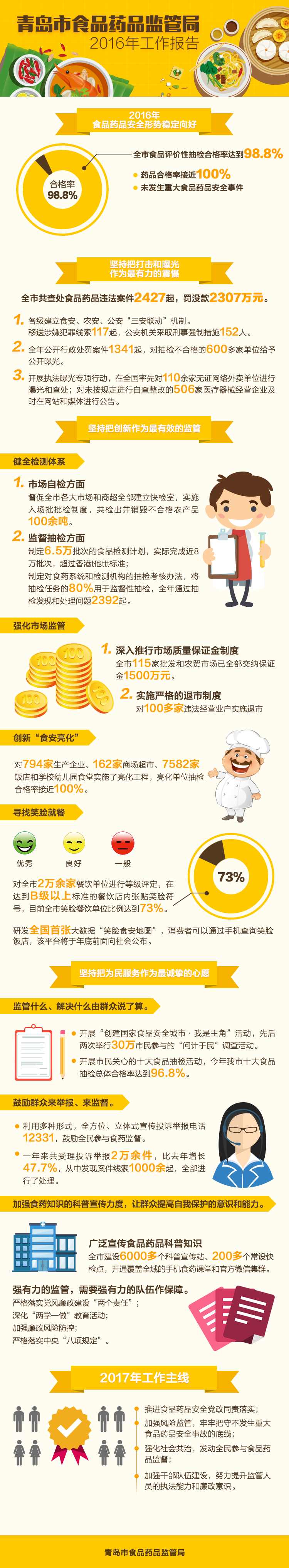 市食品药品监管局局长孙利国:市食品药品监管局围绕创建国家食品安全城市的工作主线,坚持“四个最严”标准,捍卫群众“舌尖上的安全”。经过全市上下的共同努力,食品药品安全形 势逐年好转。全市食品评价性抽检合格率达到98.8%,药品合格率接近100%,均为历史最高水平;未发生重大食品药品安全事故。各项工作走在了全国全省前列。