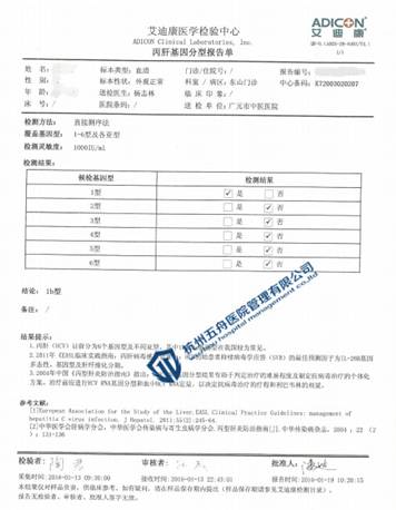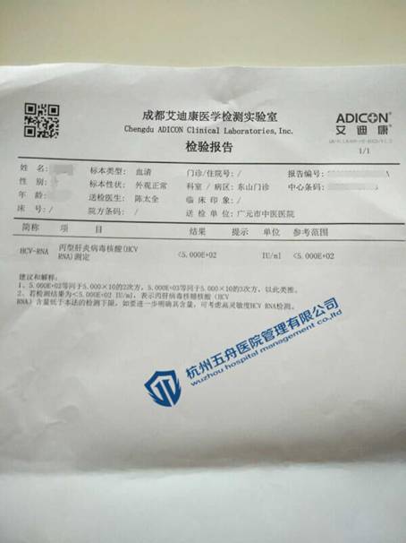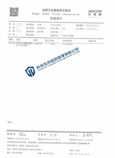 2016年1月25日,钟女士拿着病历资料和检查报告直接来到了杭州五舟。杭州五舟蒋医生看了钟女士的报告后表示她可以服用索非布韦和达卡他韦,也可以服用吉二代。而且她没有肝硬化肝功能状况还不错,只需一个疗程就可以了。钟女士对比了索非布韦和达卡他韦以及吉二代上市的时间最后决定服用索非布韦和达卡他韦。当天,钟女士就和杭州五舟签订了合同。杭州五舟工作人员把钟女士的病历资料和检查报告扫描留底后原件还给了钟女士。