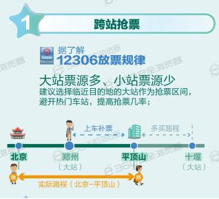 对于实在抢不到直达票的乘客,360专家建议“尝试跨站抢票,先上车再补钱”。通常火车票的放票规律为大站票源多,而小站票源少,如果直达不成,用户可选择先抢中间路过的大站的车票,上车后再补几站的票钱。比如,从北京回平顶山的旅客,可先以大站郑州为目的地买票,上车后再补票。同理,也可选择后续车站的列车车票,到达目的地时提前下车即可,这样回家就会轻松很多。