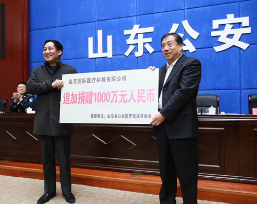 仪式由省公安厅党委委员、政治部主任修春清主持。金天国际继2015年1月向山东省公安民警优抚基金会捐赠800万元后,再次追加捐赠1000万元,善款将全部用于缓解公安英烈、因公伤残和因病致贫民警家庭困难和促进公安民警职业健康保障体系建设,金天国际集团董事局主席祖明军登台完成捐赠,山东省副省长、公安厅厅长孙立成感怀企业善举接受捐赠,并向金天国际医疗科技有限公司颁发了“爱心金盾”牌匾及荣誉证书。省人社厅领导宣布了全省13名符合条件的公安英烈子女通过相关招录程序录警,金天国际董事局主席祖明军与山东省副省长、公安厅厅长孙立成等相关部门领导现场将361.46万元助学助困金发放到因公牺牲和家庭困难民警子女、患重大疾病民警、因公伤残民警手中。