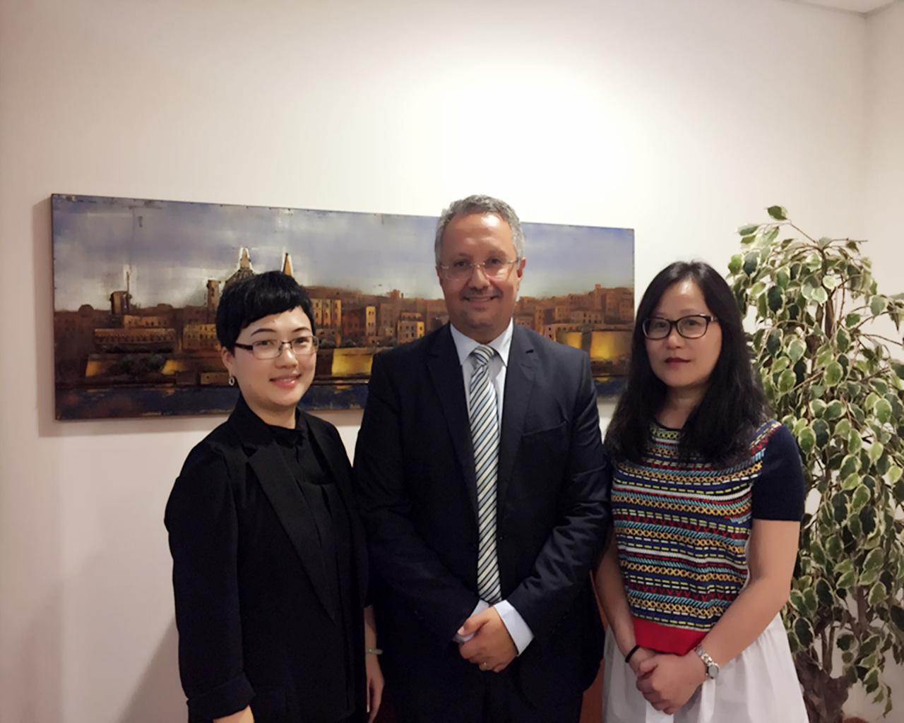 ▲景鸿集团董事长助理李玲女士(右)、项目支援部副总裁王晶女士(左)亲临马耳他移民局拜访,并与马耳他移民局局长Mr.RoderickCutajar(中)合影