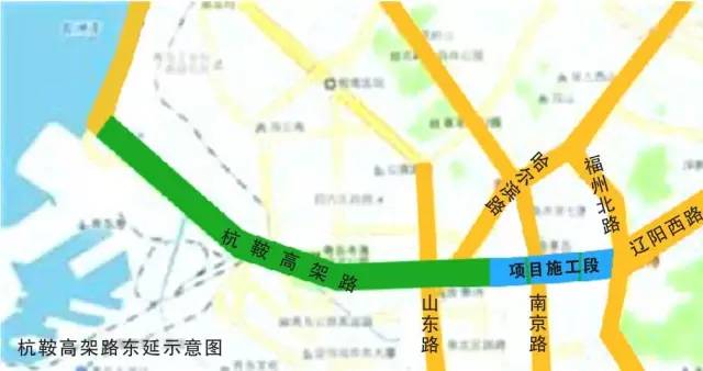 工程西起抚顺路路口,向东上跨南京路、绍兴路后落地与福辽立交相接,全长约1.6公里,是东岸城区规划“三纵四横”快速路网的重要组成,也是杭鞍高架路向东的延续,承担着胶州湾隧道和环湾路进出东岸城区的交通集散功能。规划主线采用双向六车道整体式高架桥,桥面总宽25米,地面为双向六车道辅路,红线宽度40米。
