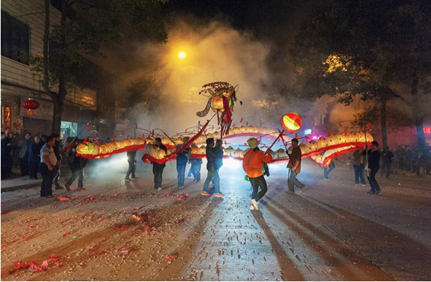 过新年,舞龙灯!侗族龙灯以竹篾编织而成,分龙头、龙身、龙尾三部分。龙的表面用纸或绢糊上,再用彩色画上龙鳞及其他部分的形状,里面点上蜡烛。每条龙均扎有排灯和花灯,还扎有鱼、鳖等动物形状。新春期间,龙以宝引路,在锣鼓的配合下游村串寨,热闹非常。