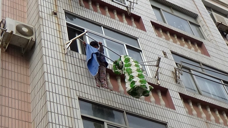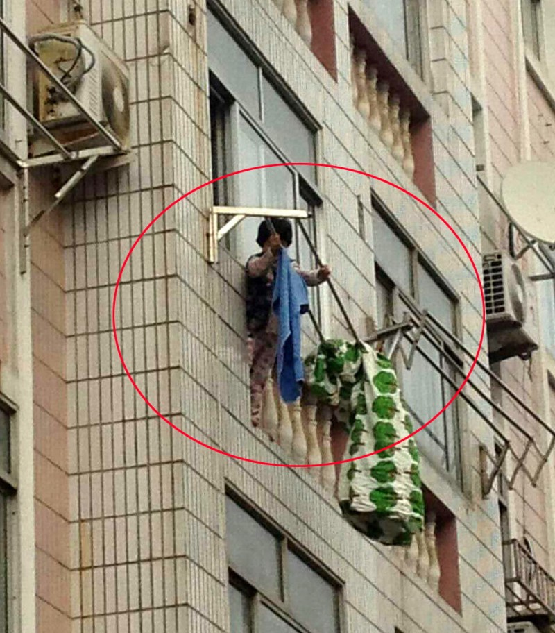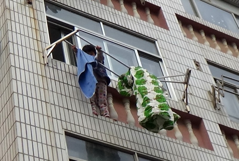 玲玲悬在三楼的晾衣架上(近景)。赵玉勋摄