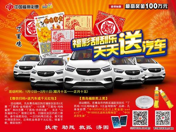 为迎接丁酉鸡年的到来,福彩刮刮乐特推出一套鸡年贺岁票——5元票“丁酉鸡-金鸡银鸡”、10元票“丁酉鸡-鸡鸣富贵”和20元票“丁酉鸡-吉祥如意”。为回馈彩票购买者,省福彩中心将于1月12日—2月11日(腊月十五——正月十五)在全省开展“福彩刮刮乐 天天送汽车”活动。关注“山东福彩中心”微信订阅号,扫描玩法区内的二维码,参与抽奖活动,就有机会获得别克SUV,还有机会再获千元红包。全省将送出30辆汽车和2200个千元红包(彩票)。此外,青岛福彩将在活动期间针对“丁酉鸡”5元、10元票种推出“中100000送ipad air2”、“中10000送科沃斯地宝”、 “中30送花生油”等回馈活动,为广大彩民带来更丰富的大奖盛宴。