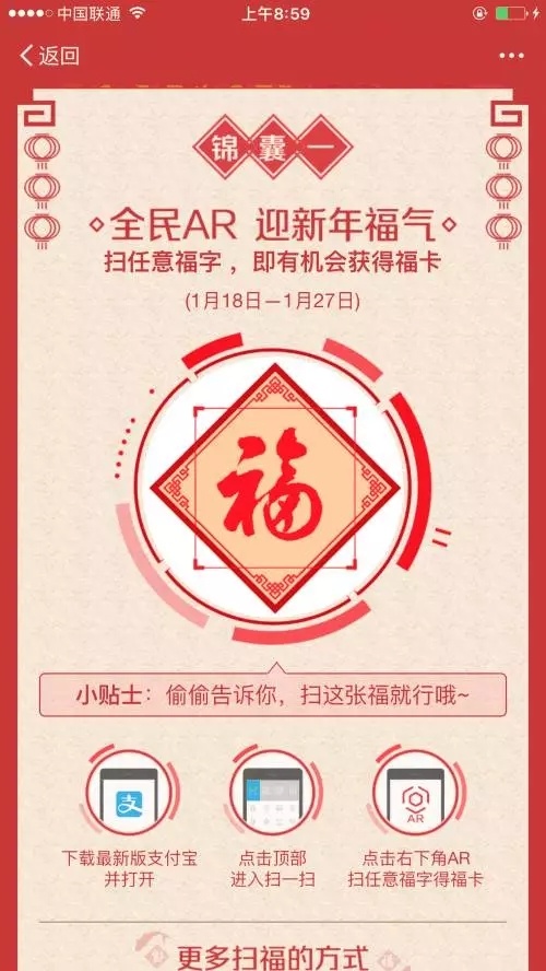 大家打开手机支付宝(10.0.0或10.0.0以上版本),在首页就能看到活动入口,使用AR扫一扫任意“福”字,就有机会领取一张福卡。