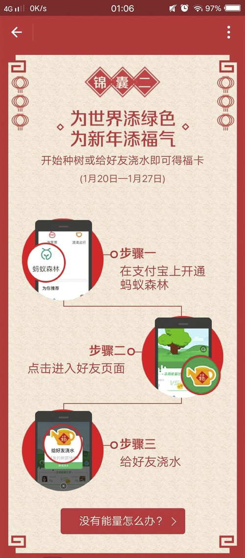 还有,从1月20日(腊月二十三)开始到除夕夜22点之前,用户开通蚂蚁森林或者给好友浇水,可以随机获得福卡。