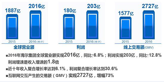 现场海尔集团总裁周云杰发布了“海尔集团2016年度工作报告”,海尔2016年全球营业额预计达2016亿元,同比增长6.8%;利润预计实现203亿,同比增长12.8%;互联网交互产生的交易额约2727亿;近十年收入复合增长率达6.1%,利润复合增长率达30.6%。更值得一提的是,海尔集团董事局主席、首席执行官张瑞敏宣布,海尔将用7年的时间在年全球营业额上翻一番,力争突破4000亿元。