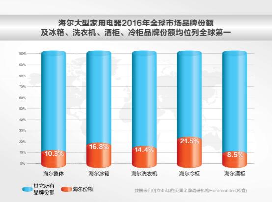1月10日,世界权威市场调查机构欧睿国际(Euromonitor)正式签署发布的2016年全球大型家用电器品牌零售量数据显示:海尔大型家用电器2016年品牌零售量占全球市场的10.3%,居全球第一。此外,海尔的足迹已经遍布全球160多个国家和地区,在全球建立108个工厂,工厂面积加起来有1309万平方米,海尔已经完成了从中国品牌到全球品牌的蜕变,赢得了全球用户的认可。而海尔的全球化足迹也为他绘制了一张能够在全球畅通无阻的“世界身份证”。