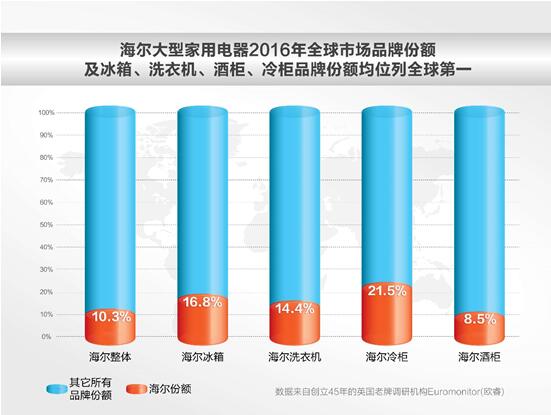 2017年1月10日,世界权威市场调查机构欧睿国际(Euromonitor)正式签署发布的2016年全球大型家用电器品牌零售量数据显示:海尔大型家用电器2016年品牌零售量占全球市场的10.3%,居全球第一,这是自2009年以来海尔第8次蝉联全球第一。此外,冰箱、洗衣机、酒柜、冷柜也分别以大幅度领先第二名的品牌零售量继续蝉联全球第一。