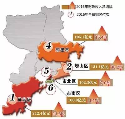 尤其令人振奋的数据是,2016年,财政收入过百亿元的县市区,全省共有6个,其中,除排名第三的济南市历下区外,其他5个都在青岛市,排名依次为黄岛区、崂山区、即墨市、市北区和市南区。