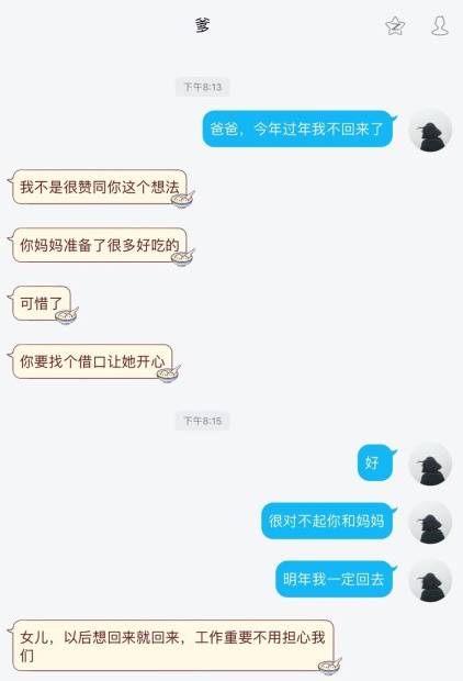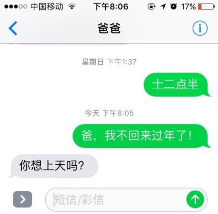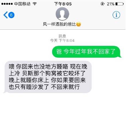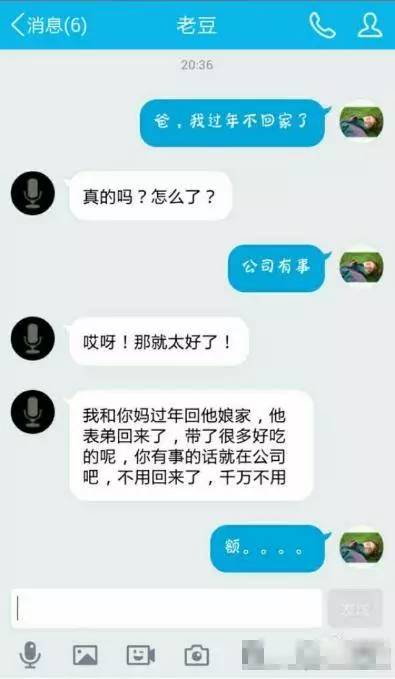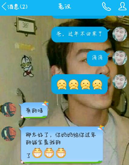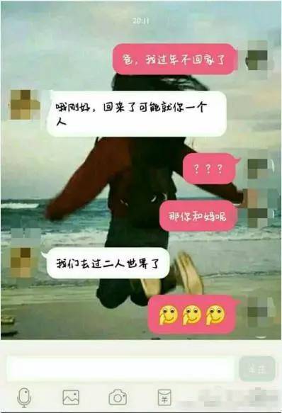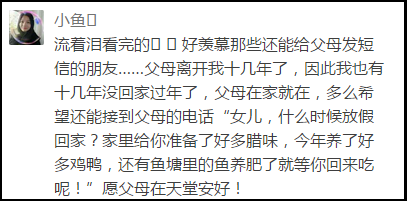 MR.郭:春节,爸爸已经缺席10年了,前不久去祭奠了一下,虽然很想哭,但在妈妈面前我不能掉眼泪,这10年我从一个少年变成家里的支柱,有很多泪水只能偷偷一个人流下,只为不让妈妈担心!我,多想收到爸爸的问候:“儿子,过年回家吗?”
