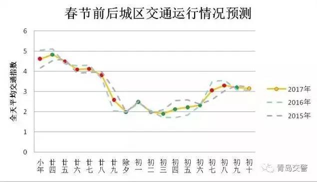 春节假期期间(除夕至正月初六)城区交通指数呈现低位持平趋势,受走亲访友的影响,初一会出现相对小高峰。
