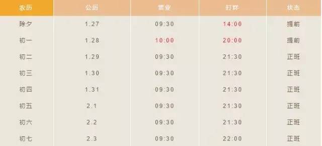 1月28日至1月30日(初一至初三)执行春节时间表,晚上提前结束营业。